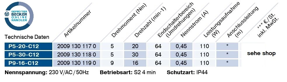 Becker - Universal-Markisenantriebe mit integriertem Funkempfänger P5-C12 bis P9-C12, Serie P, Typ C12