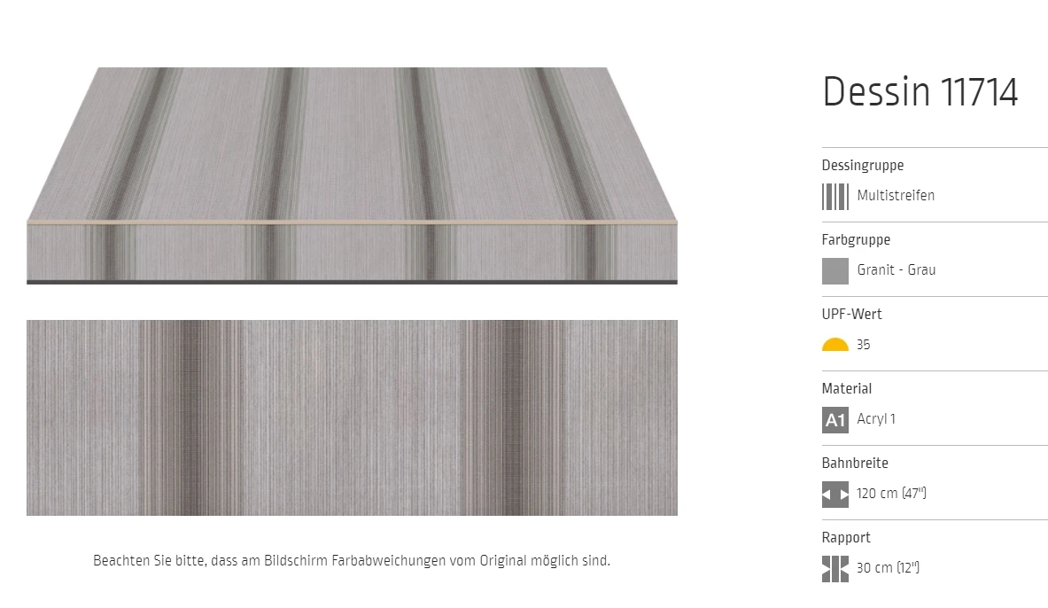 Bei allen Markisenstoffen können Unregelmäßigkeiten in der Oberflächenbeschaffenheit auftreten.