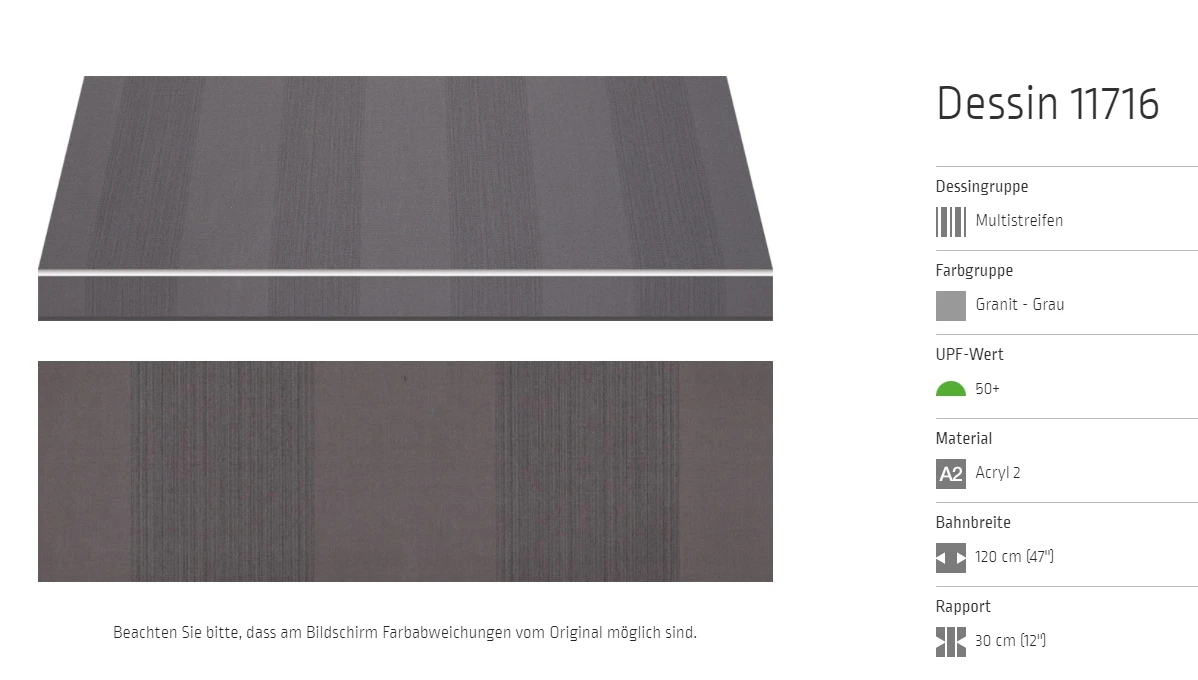Bei allen Markisenstoffen können Unregelmäßigkeiten in der Oberflächenbeschaffenheit auftreten.
