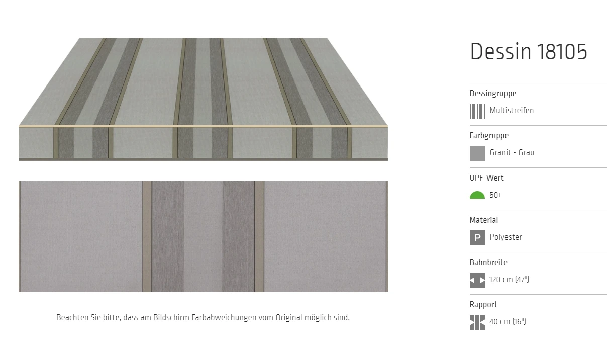 Bei allen Markisenstoffen können Unregelmäßigkeiten in der Oberflächenbeschaffenheit auftreten.