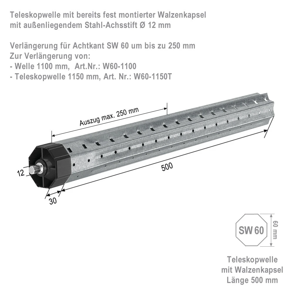 Teleskopwelle SW 60, Länge 500 mm, aus feuerverzinktem Stahl, für Achtkantwelle SW 60, montiert mit Walzenkapsel, außenliegender Achsstift Durchmesser 12 mm, max. Auszug 250 mm