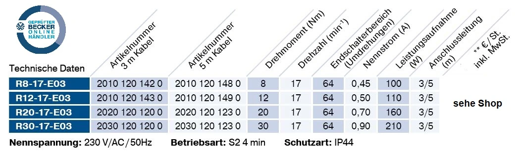Becker Rollladenantriebe R7-E03 bis R30-E03, Serie R-E03