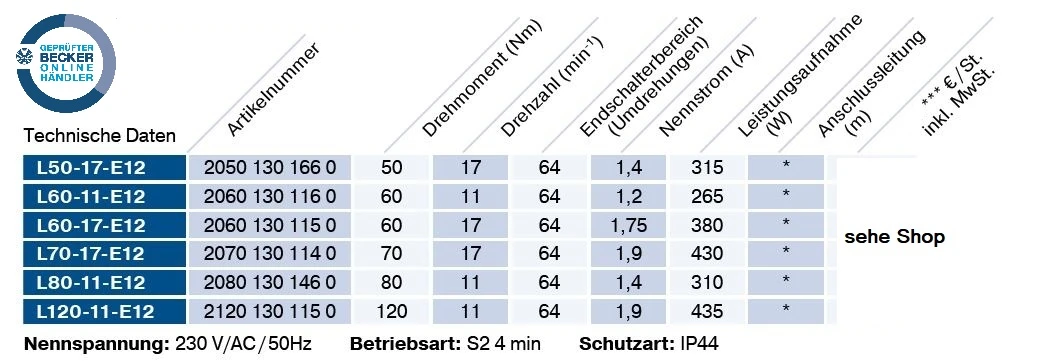 Becker - Universal Markisenantriebe L50-E12 bis L120-E12 Serie L-E12