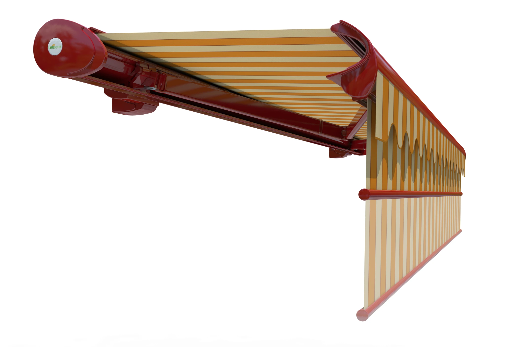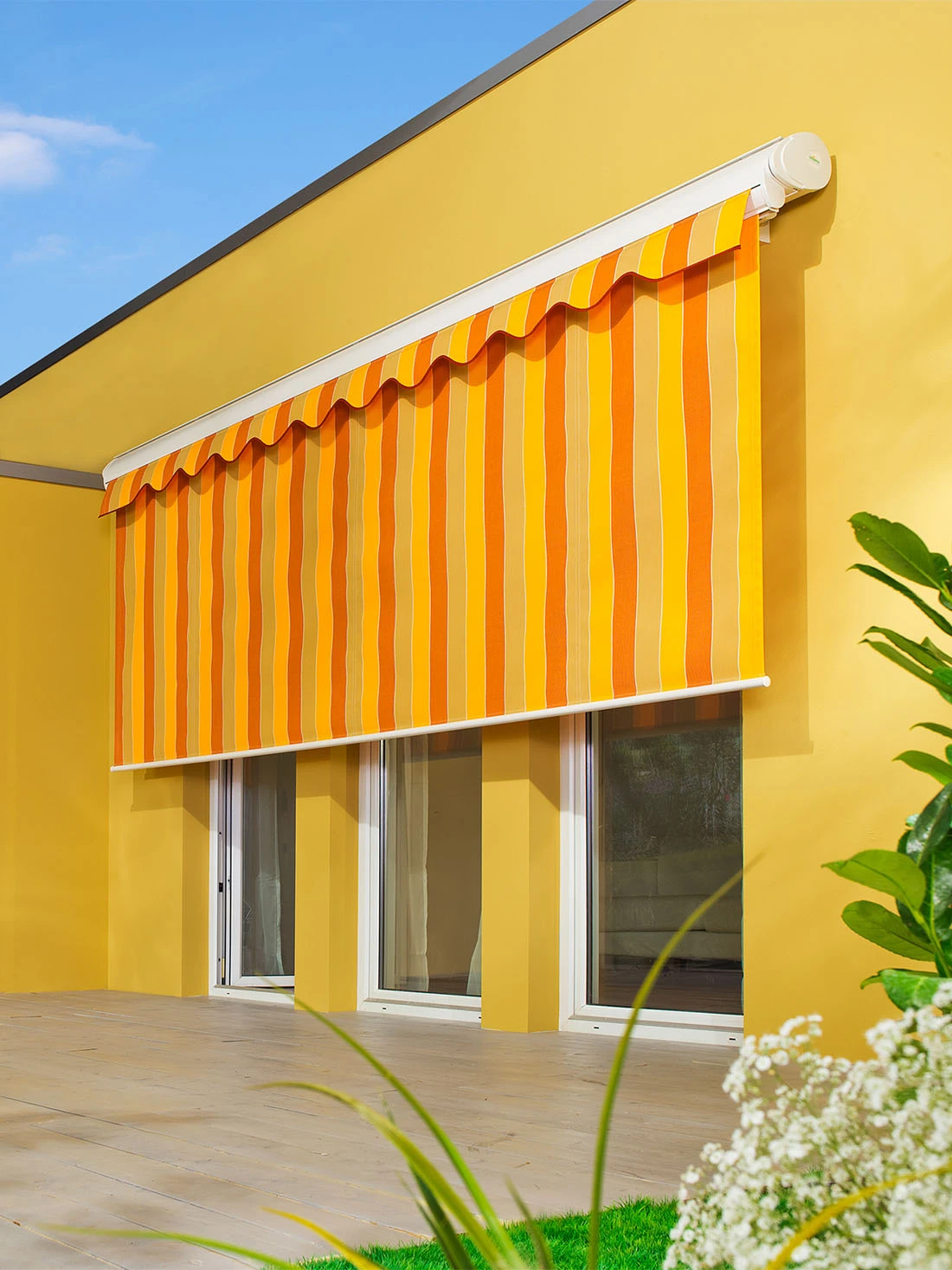 Diese große Vollkassette mit selbsttragendem Gehäuse besticht durch Kompaktheit und Eleganz bei gleichzeitiger Größe. Mit max. bis 700 cm Breite und bis 400 cm Ausfall für große Flächen geeignet. Der optionale Vario Volant bietet variablen Sonnen- und Sichtschutz.