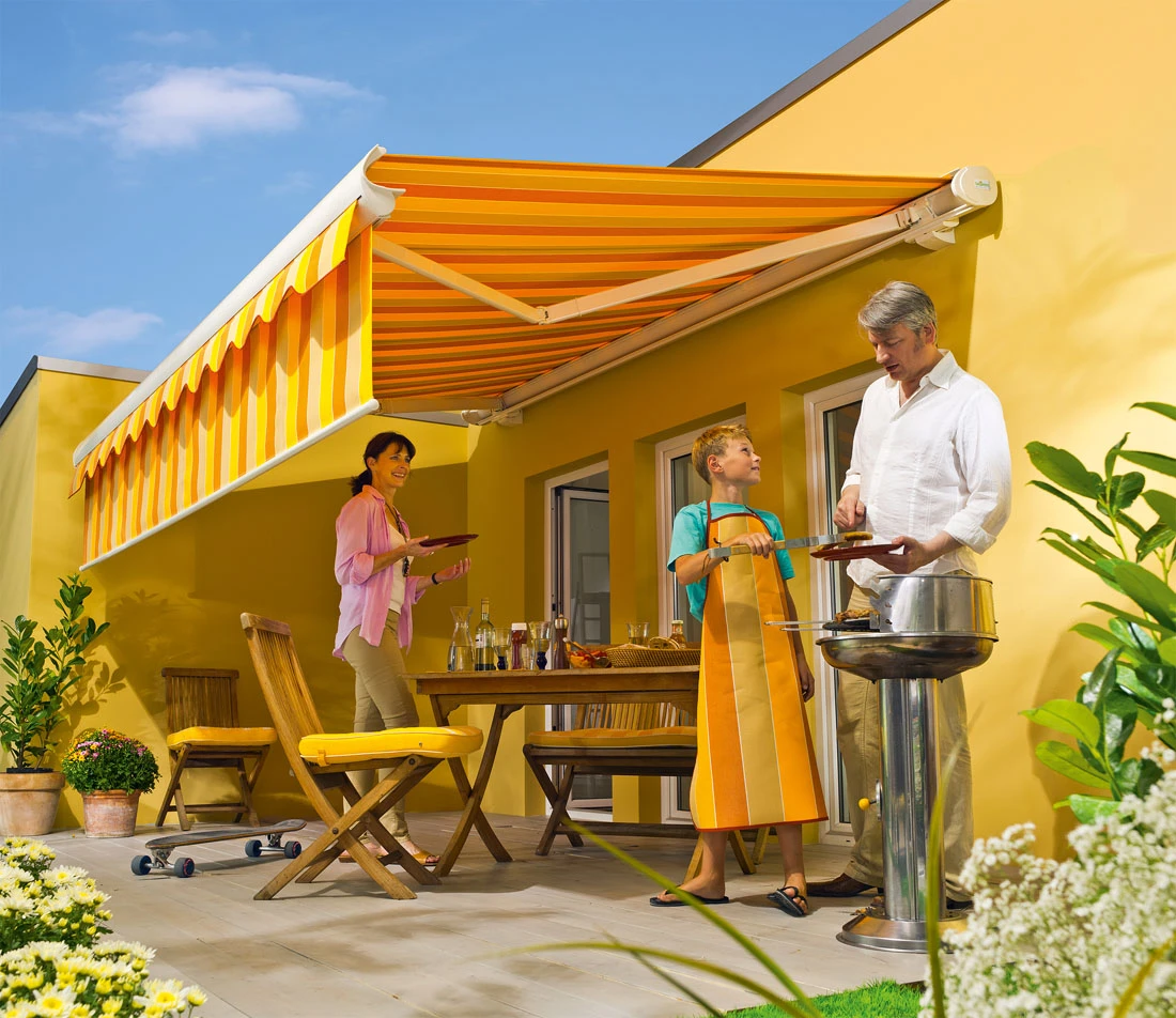 So sieht Arbeitsteilung à la Sommer aus: Die Mama deckt den Terrassentisch und bereitet die frischen Salate vor, der Sohnemann darf das Fleisch grillen und der Papa muss danach abräumen und abwaschen. Markisenglück pur!