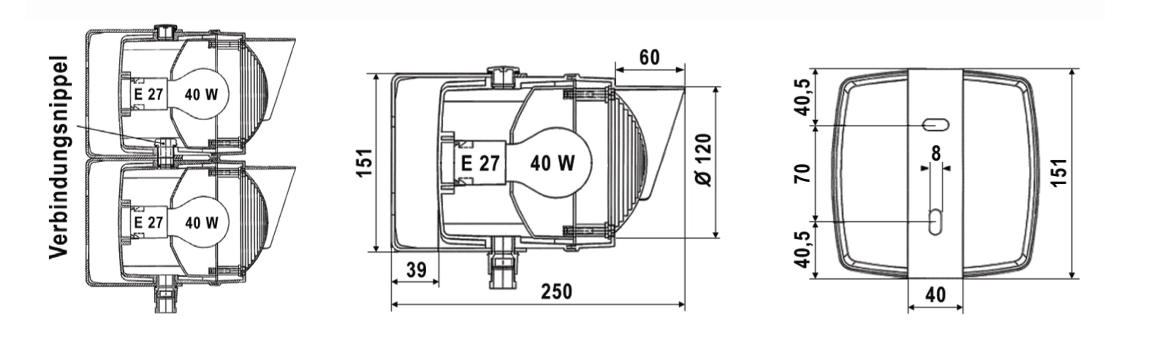 Maße (LxBxT): 151 x 151 x 250 mm (mit Montagebügel)