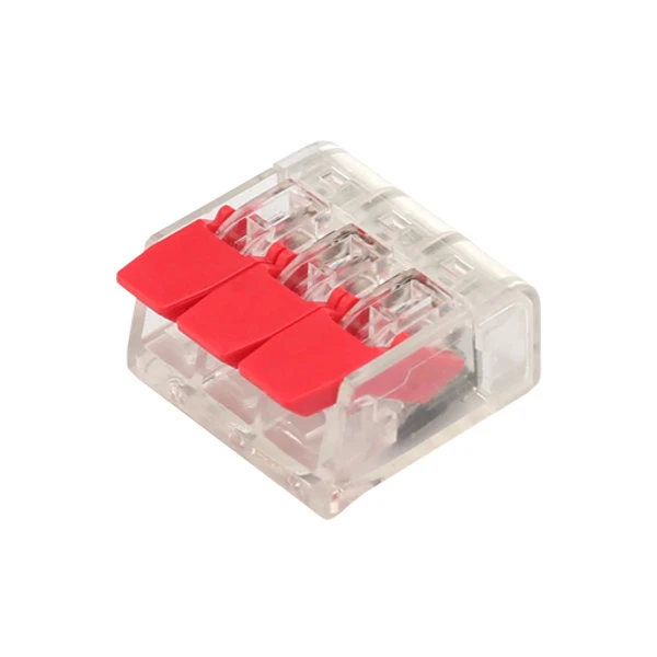 Compact-Verbindungsklemme Serie KLV, 3 Leiter mit 3 Betätigungshebeln/Klemmhebeln, Farbe transparent/rot.