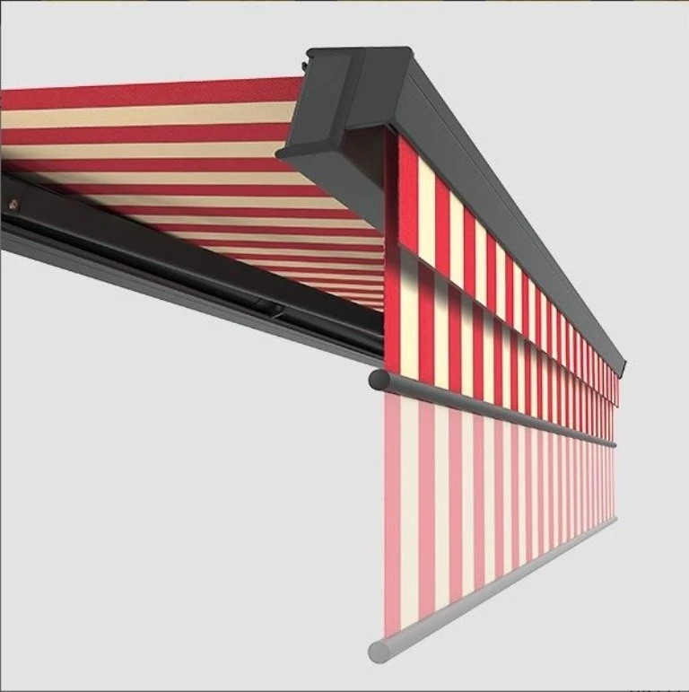 Der Vario Volant bietet einen variablen Sonnen- und Sichtschutz, wobei die Durchgangshöhe unter der Markise erhalten bleibt.