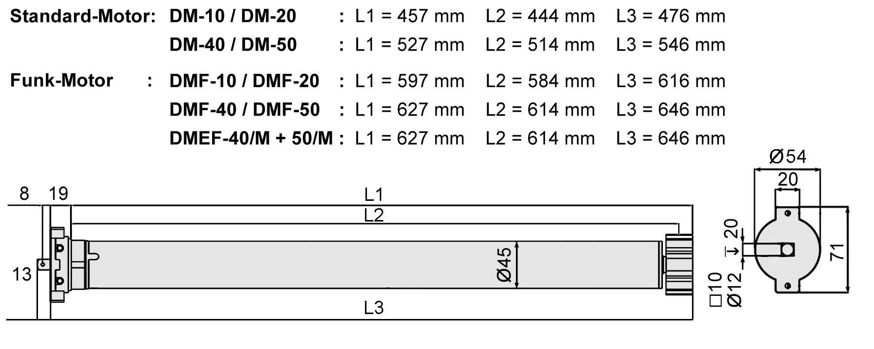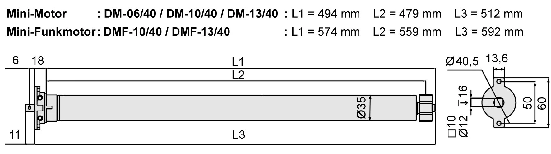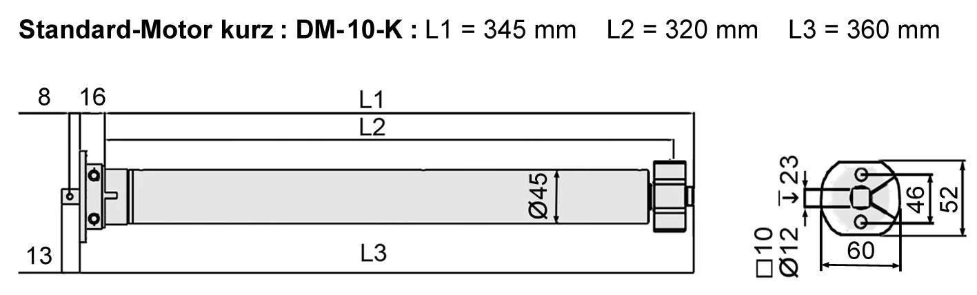 DM-10-K besonders kurzer Standard-Motor mit einer Gesamtlänge von nur 375 mm - ideal zur Motorisierung von sehr schmalen Fenstern.