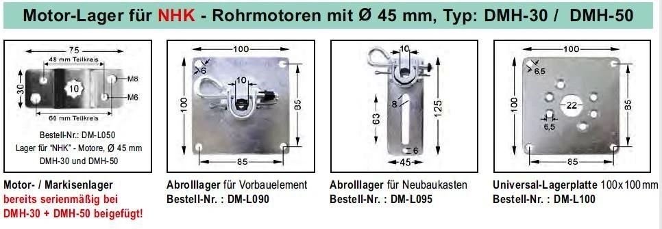 Alle Motoren: iinklusive Adapterset für 60 mm Achtkantwelle und Motor-/Markisenlager.